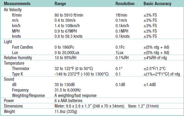 美國Extech EN300風(fēng)速/溫濕度/照度/噪音多功能測量儀的技術(shù)參數(shù):