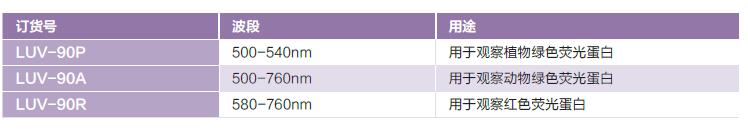 LUV-90P 用于觀察植物綠色熒光蛋白 LUV-90A 用于觀察動物綠色熒光蛋白 LUV-90R 用于觀察紅色熒光蛋白