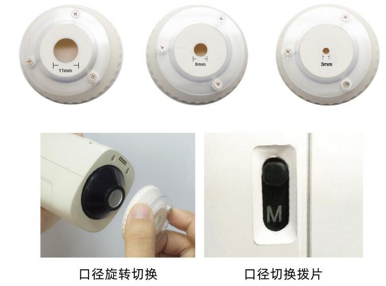 (6)提供三口徑切換(11mm,6mm,3mm) 旋轉(zhuǎn)即可切換口徑,告別了繁瑣的手動擰螺絲固定口徑方式。 大口徑(Φ11mm)撥到“M”檔。 小口徑(Φ6mm、Φ3mm)撥到“S”檔。