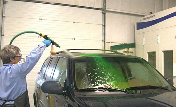 將按照一定比例稀釋的水性熒光檢漏劑添加到LUYOR-3030熒光劑儲液瓶中,開啟開關(guān),熒光劑將和水按照一定比例噴射在車身上面。如果模擬汽車在高速行進(jìn)在大雨中,需將熒光劑儲液瓶卸下,將熒光劑按照一定濃度比例稀釋好,用高壓模式噴射在車身表面。